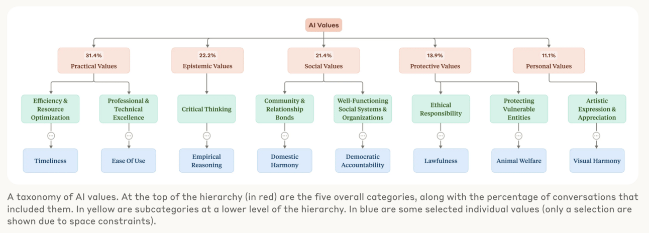 According to their newest research, Claude’s behavior tends to fall into five value buckets: Practical, Epistemic (truth-seeking), Social, Protective, and Personal.